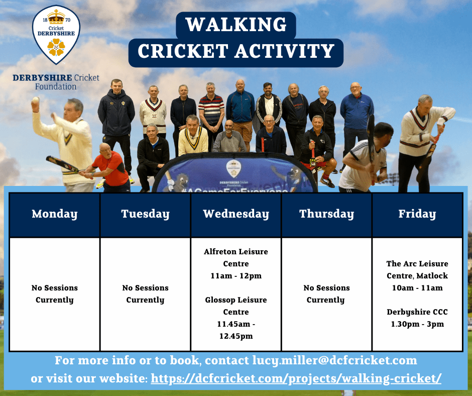 The Derbyshire Cricket Foundation are running a walking cricket session at The Arc Leisure Centre Fridays 10:00-11:00, specifically aimed at those ladies and gentlemen who are looking to keep physically and socially active. We welcome all abilities and our sessions focus on enjoyment. Please book before arrival- click more info.
